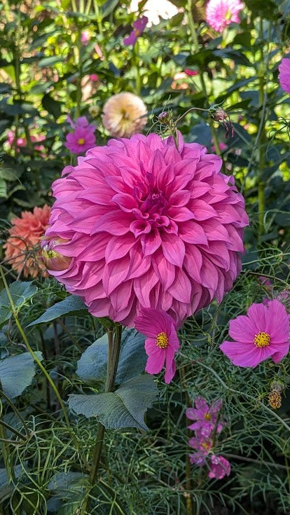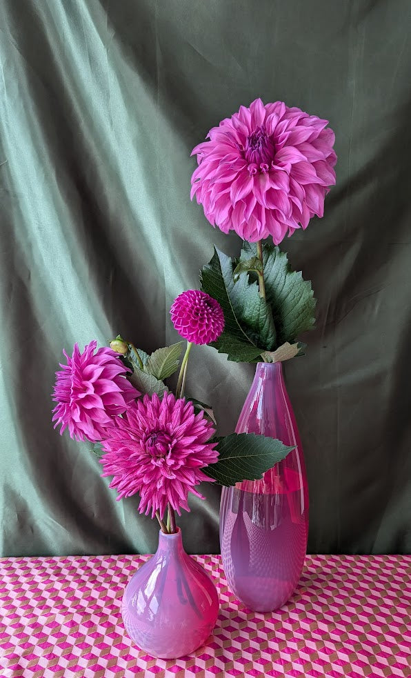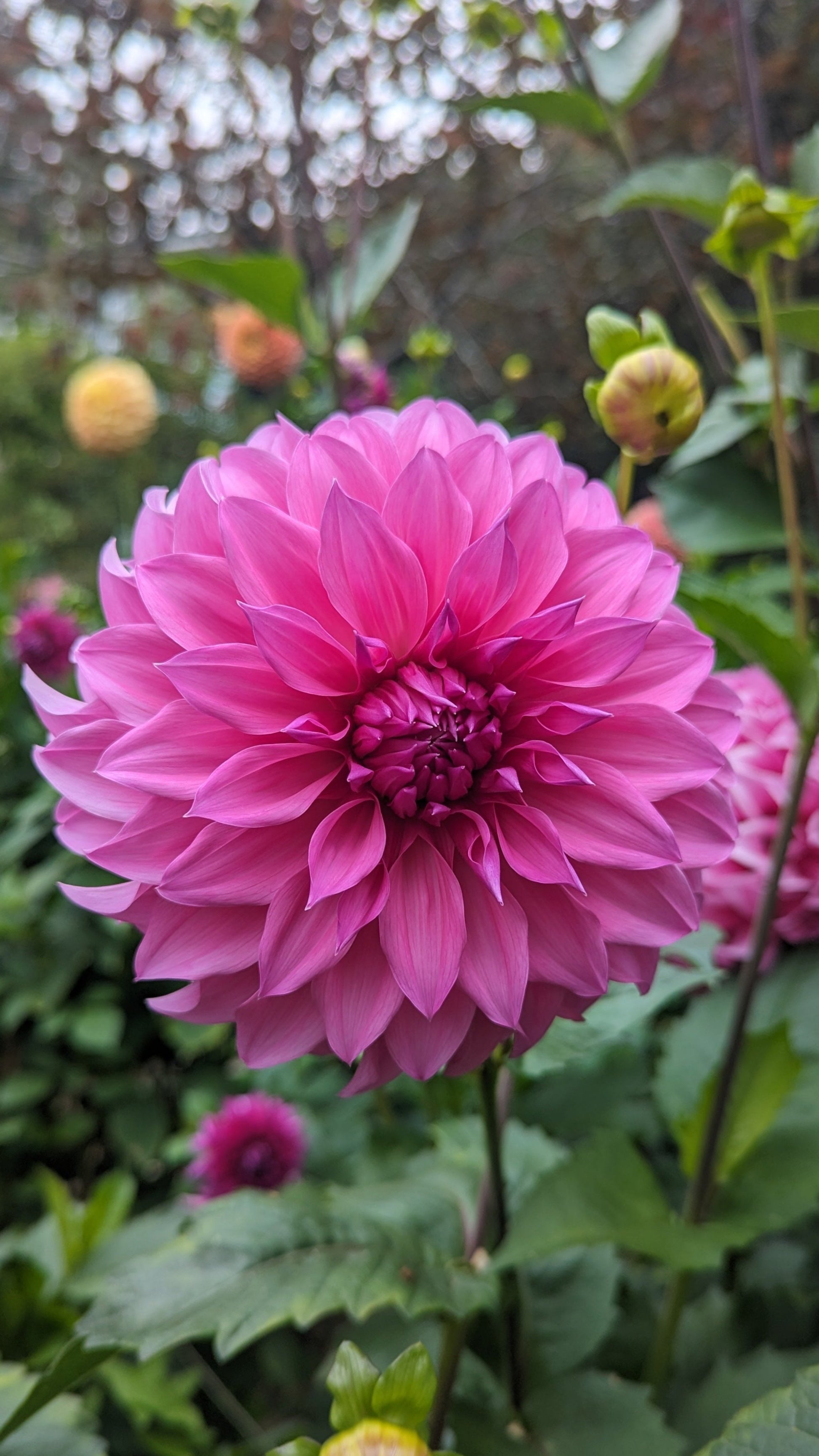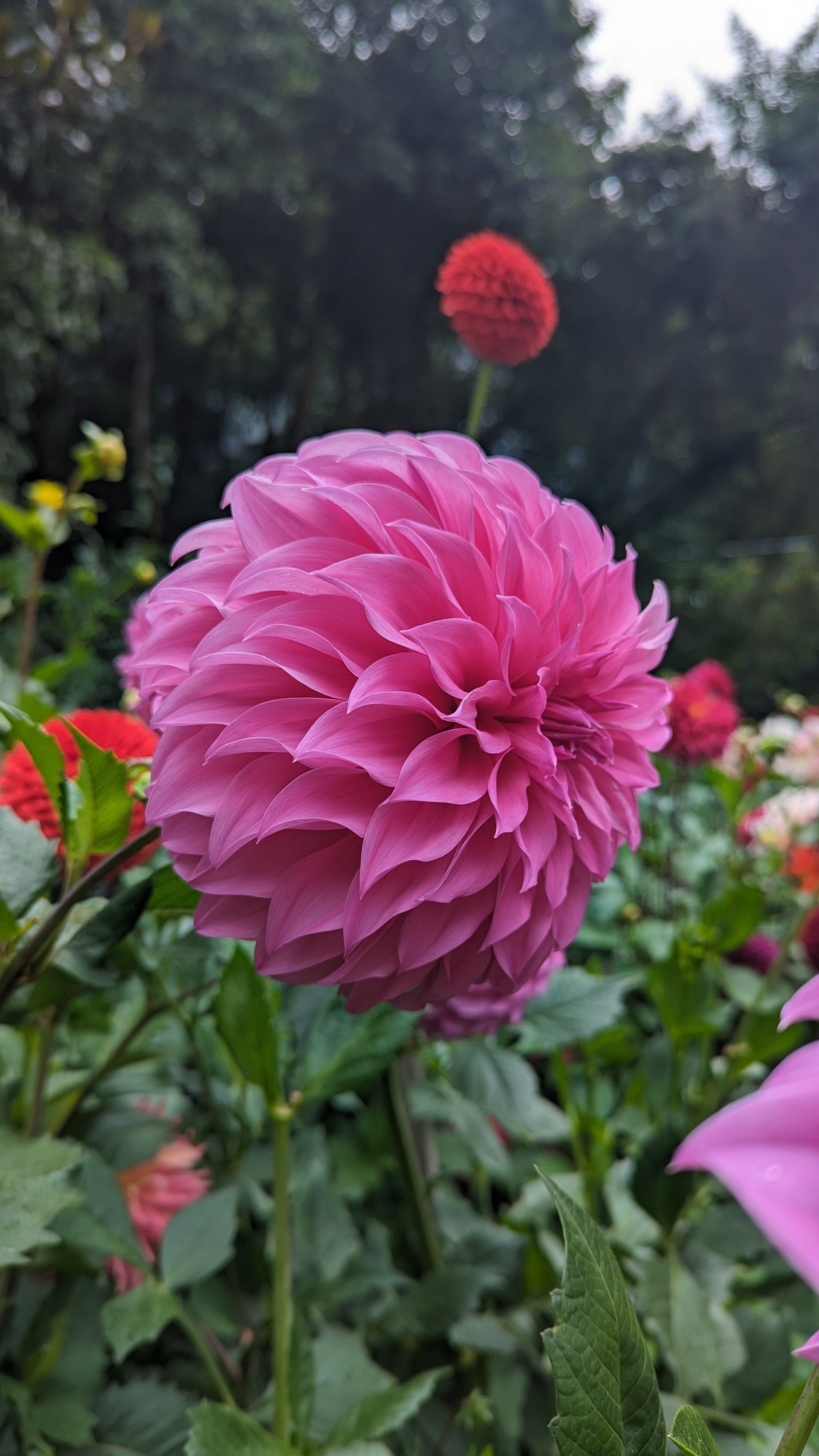 Warm pink, medium decorative with beautiful wavy petals that reflex back to stem.
