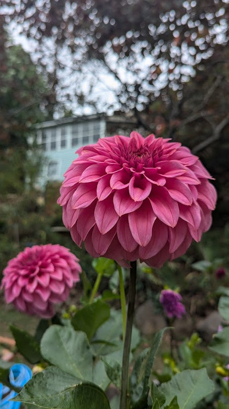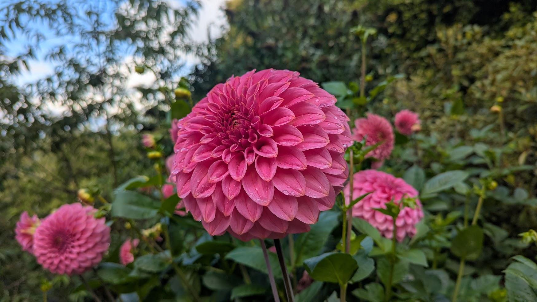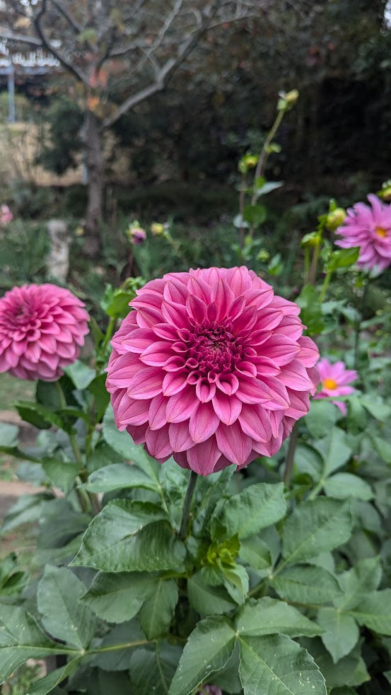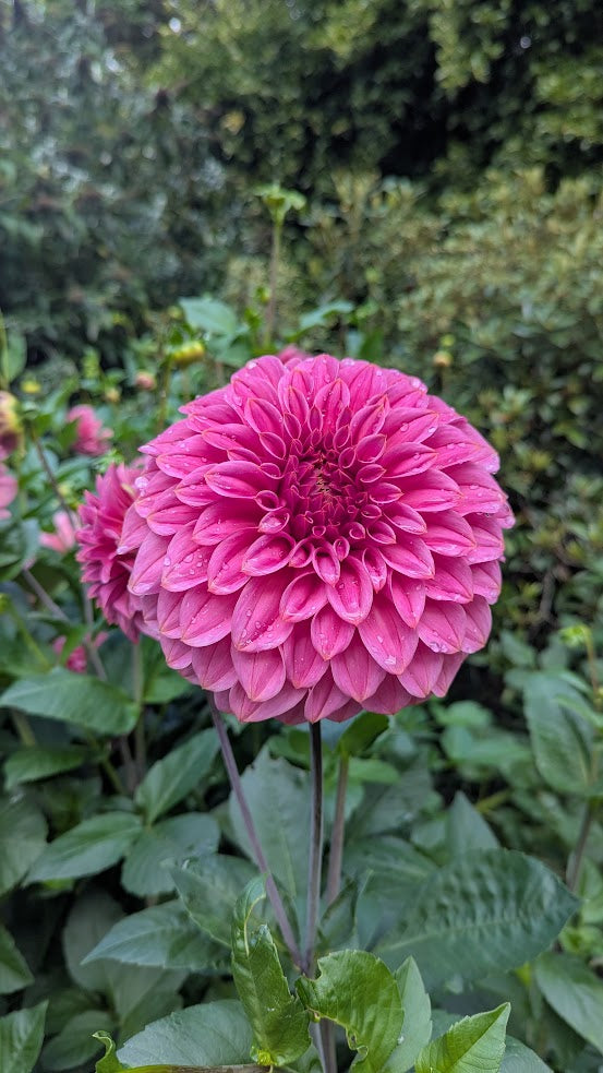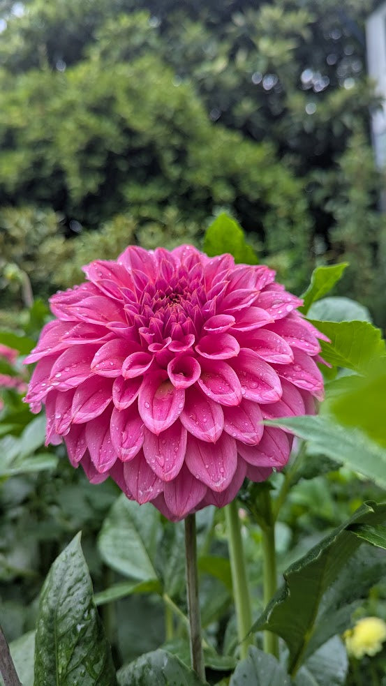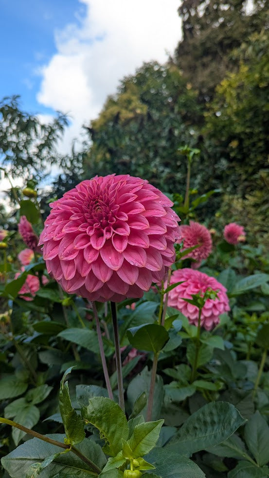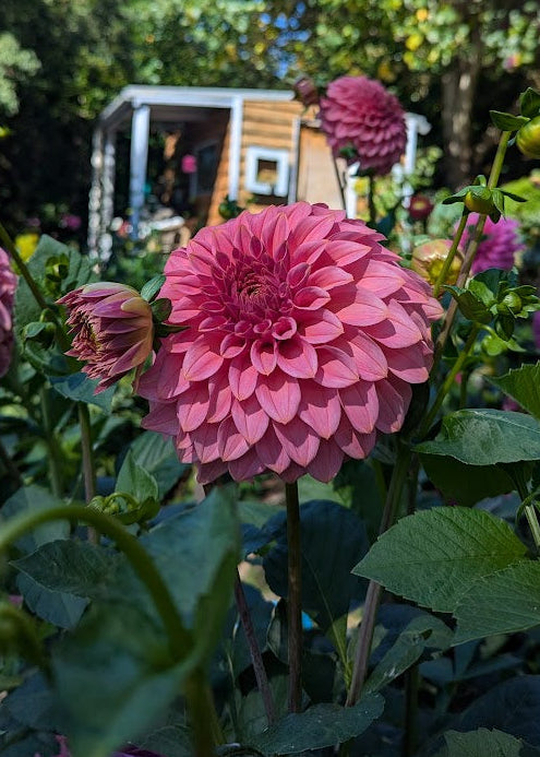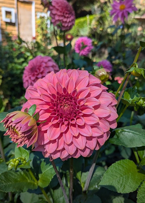 Watermelon pink with golden tips, medium decorative dahlia. Strong stems and dark folliage.