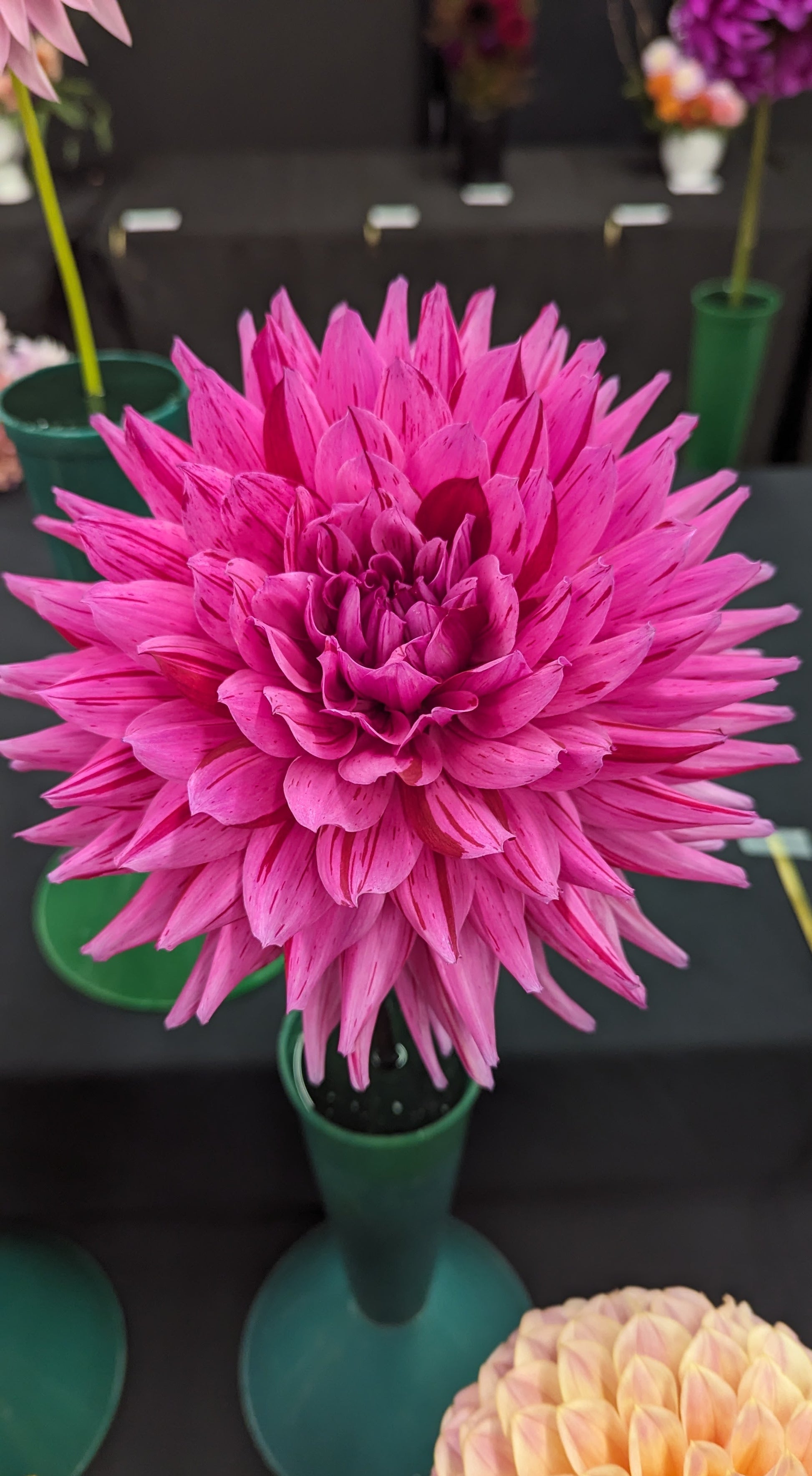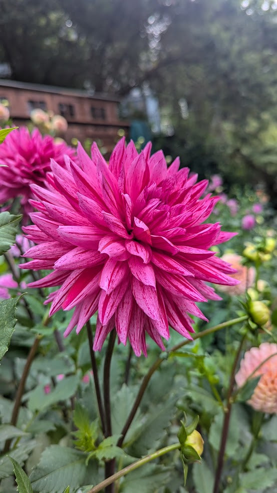 Varigated hot pink and burgandy medium semi cactus. A florifourous plant with dark stems. Can be grown to a large size if disbudded and fed well.