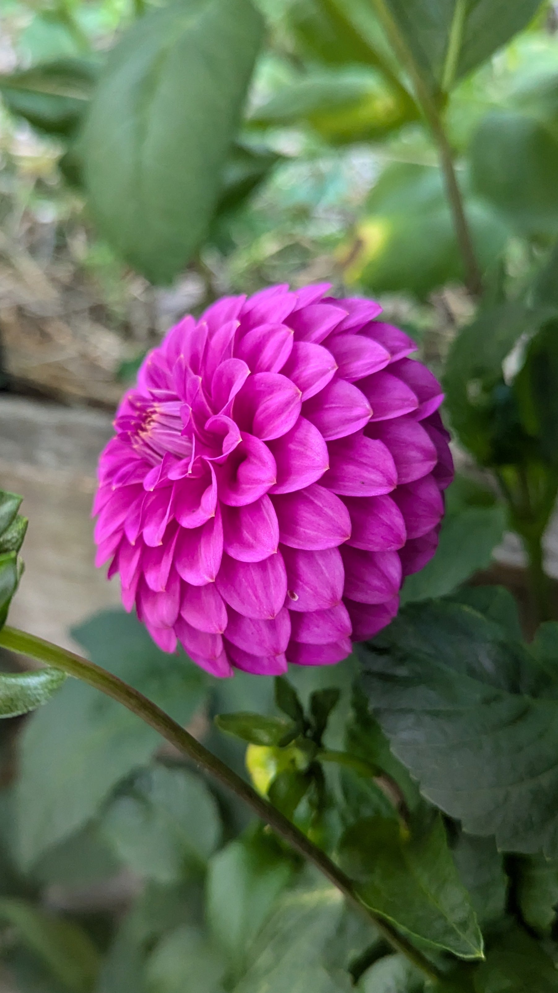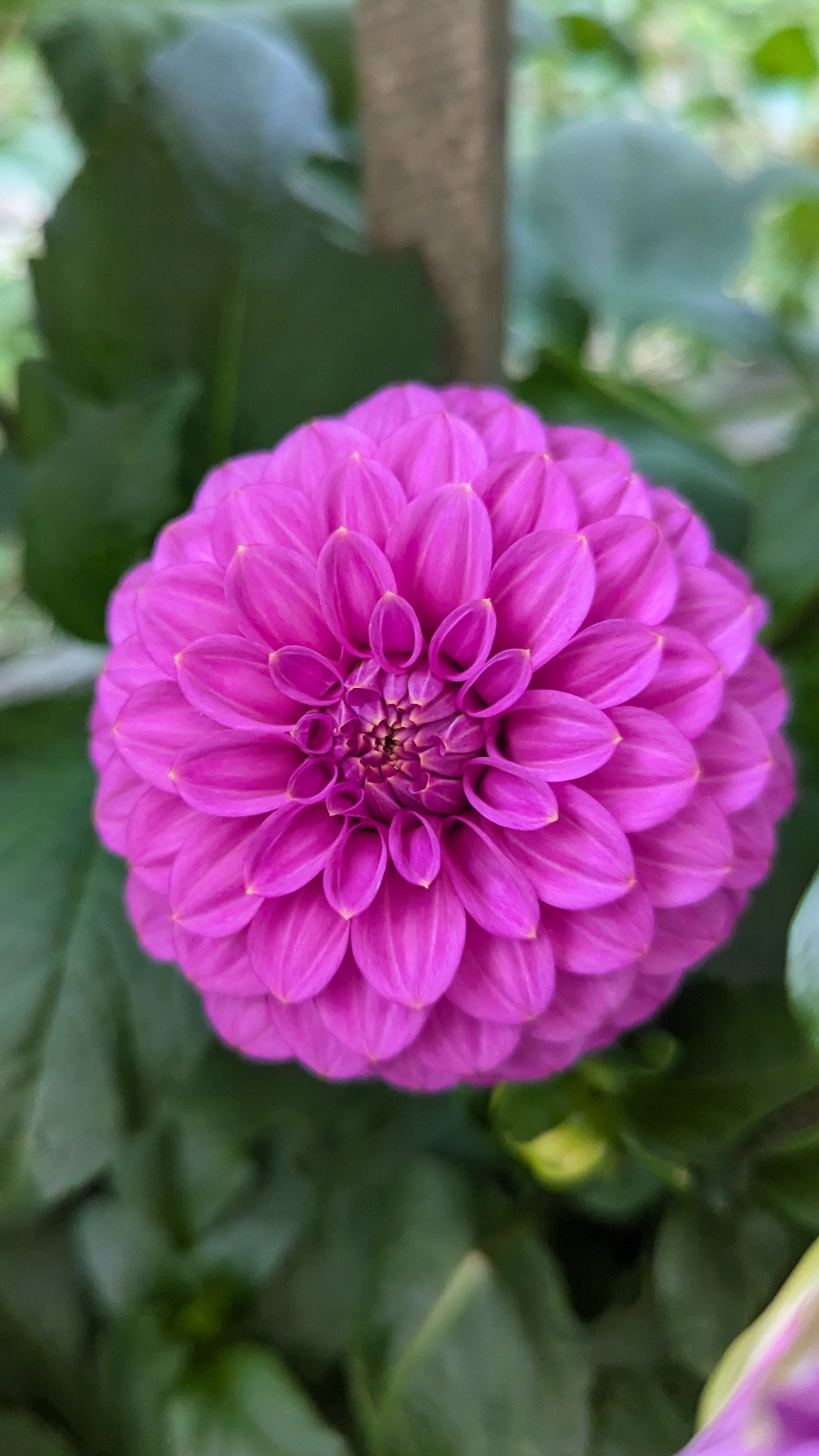 Beautiful deep pink small decorative dahlia. Great even petal tessellation and round form.