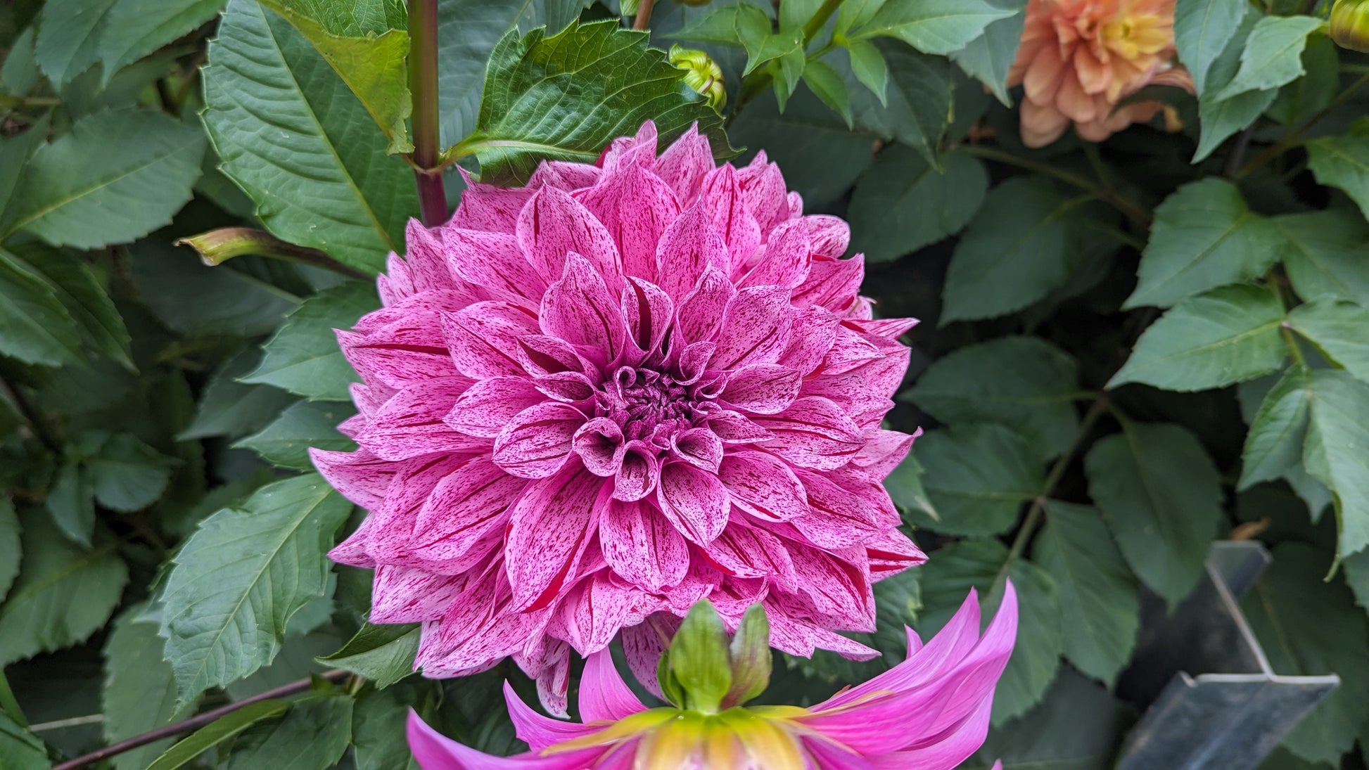 Purple varigated large decorative dahlia. Short sized garden plant.